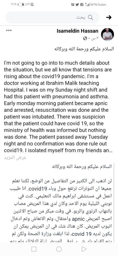 كشف الطبيب عصام الدين حسن عن وفاة شخص مشتبه بمرض كورونا حضر يوم الأحد إلى مستشفى إبراهيم مالك مصاب بالإلتهاب الرئوي والربو . لتتفاقم حالته صباح الإثنين وتوقف عن النطق. واضاف الدكتور خلال بوست على صفحته الشخصية على الفيسبوك عن شكوك بأن يكون المريض يحمل فيروس كورونا مضيفا أنه أبلغ وزارة الصحة لكن لم يتم القيام بشئ وتوفي المريض ليلة الثلاثاء وكشف الطبيب أنه يعاني من حمى عالية.الدرجة وأنه قام بعزل نفسه من عائلته وأصدقائه. موضحا أنه لايوجد أى رد من الوزارة ولايتم إتخاذ أى إحتياطات من قبل اي مستشفى عام. ونصح زملاءه الأطباء بتوخي الحذر والوقاية عند التعامل مع أى مريض.