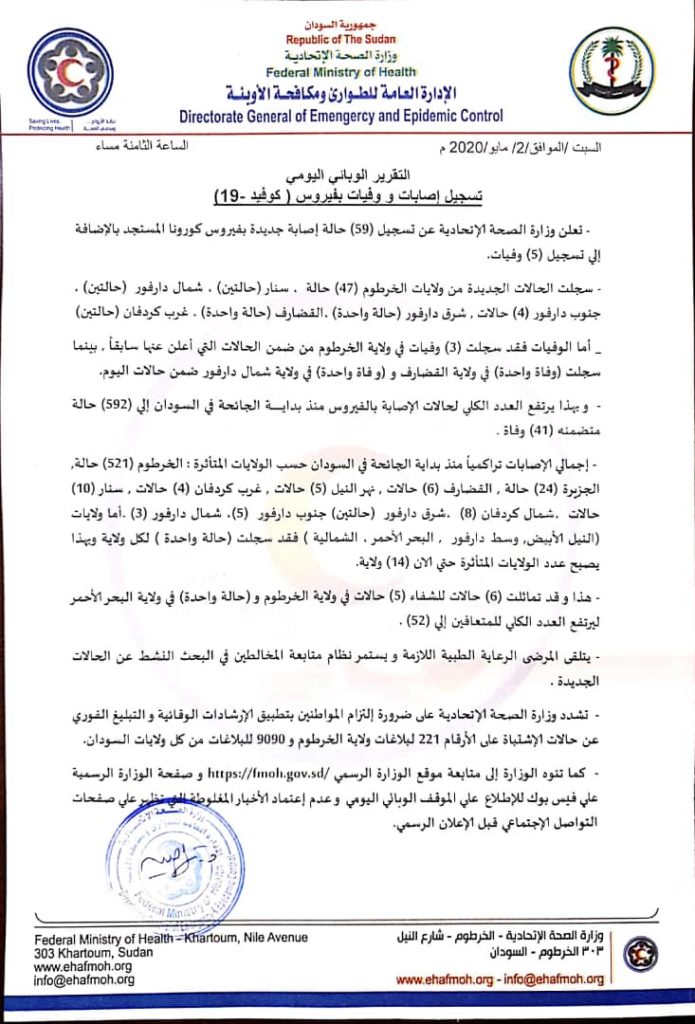 و بهذا يرتفع العدد الكلي لحالات الإصابة بالفيروس في السودان منذ بداية الوباء إلى (592) حالة، متضمنة (41) وفاة.