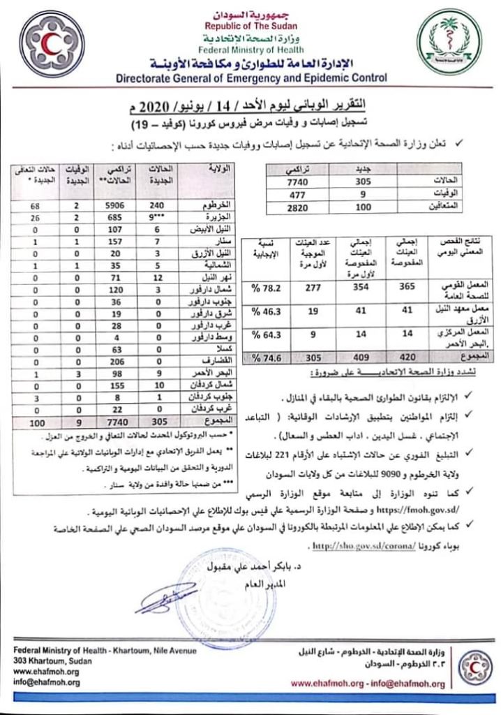 اعلنت وزارة الصحة السودانية عن تسجيل (305) إصابة جديدة بفيروس كورونا المستجد، وتسجيل (9) وفاة، منها (240) حالة إصابة، داخل ولاية الخرطوم، بحسب التقرير الوبائي الأحد 14 يونيو 2020م.