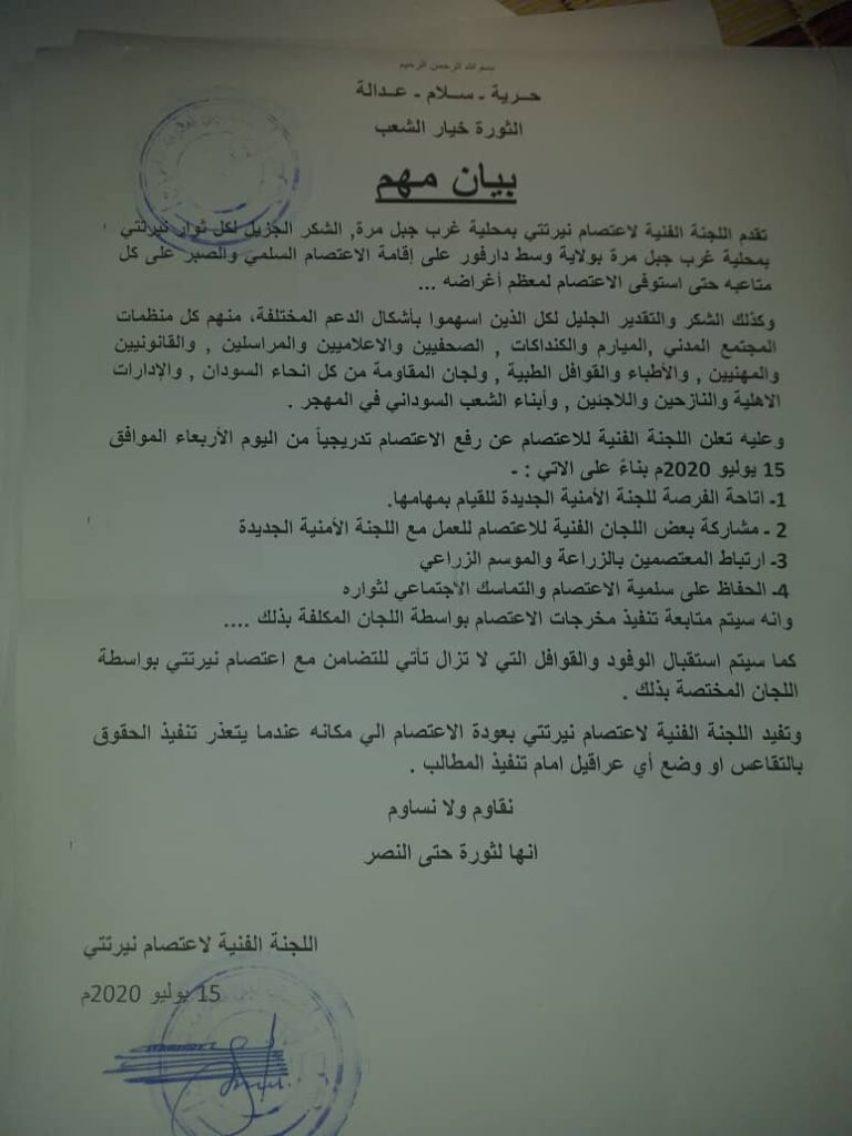 قررت اللجنة الفنية لاعتصام نيرتتي إنها الاعتصام الذي استمر لاكثر من من شهرين بشكل تدريجي اعتباراً من امس الاربعاء حتى تعطي فرصة للمزارعين للعودة إلى الزراعة وكذلك السماح للحكومة بتنفيذ المطلوبات ، وجاء قرار اللجنة بعد أن استجابت الحكومة لمطالب المعتصمين ، وشكرت اللجنة كل اللذين شاركوها الاعتصام وساندوها حتى ينتهي بشكله السلمي، وابانت انه في حالة عدم تكملة تنفيذ المطالب فانها سوف تعود لارض الاعتصام.
