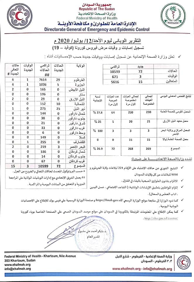 أعلنت وزارة الصحة الاتحادية عن تسجيل (72) حالة إصابة جديدة بفيروس كورونا المستجد، ليرتفع العدد الكلي لحالات الإصابة بالفيروس منذ بداية الجائحة في السودان الى (10599) حالة، في حين تم تسجيل (3) حالة وفاة، وتماثل (15) حالة للشفاء.
