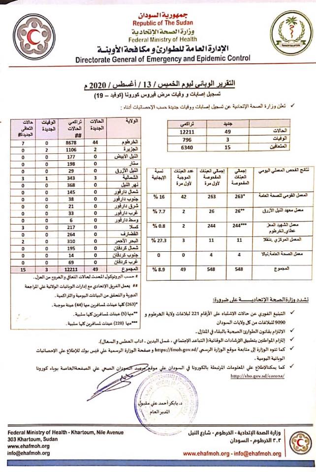 أعلنت وزارة الصحة الإتحادية ، عن تسجيل “49”إصابة جديدة بـفيروس كورونا و “3” حالة وفاة و”15″ حالة تعافي . ليرتفع إجمالي الإصابات إلى “12211” و”796″ حالة وفاة