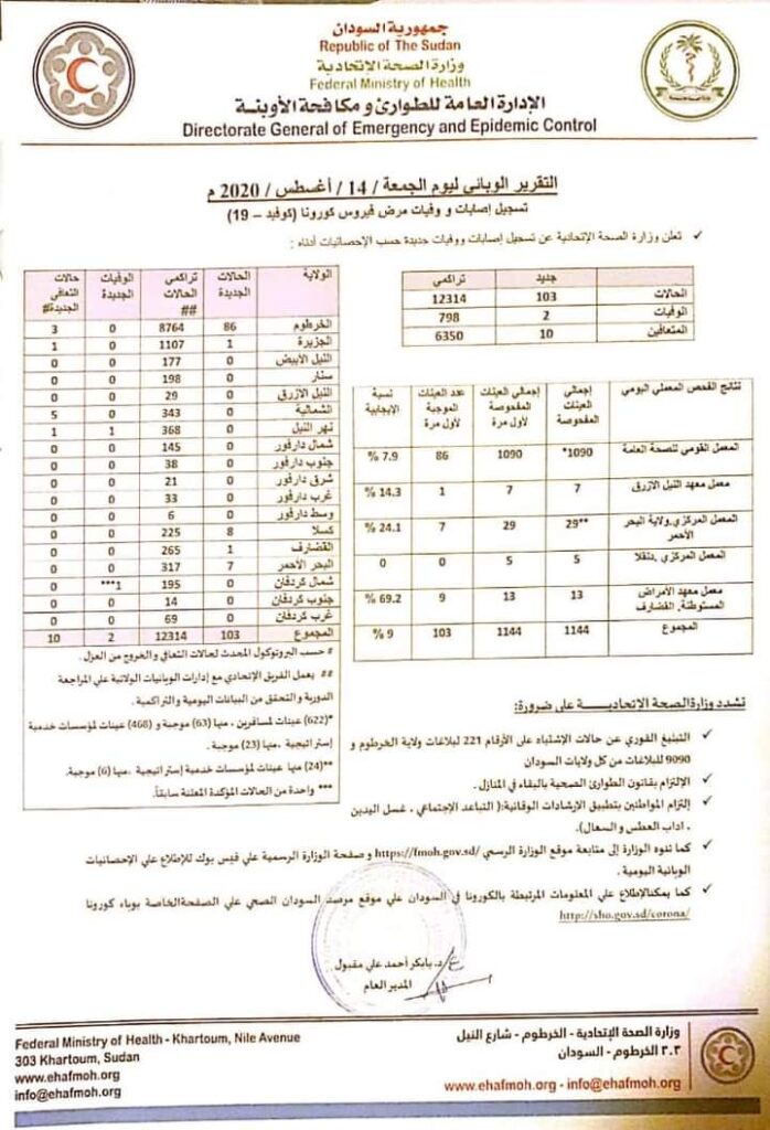 وبلغ إجمالي الإصابات بكوفيد ـ19″ في السودان”12″ ألف و”314″، فيما تعافى”6″ ألف و”350″، وتوفي”798″.
