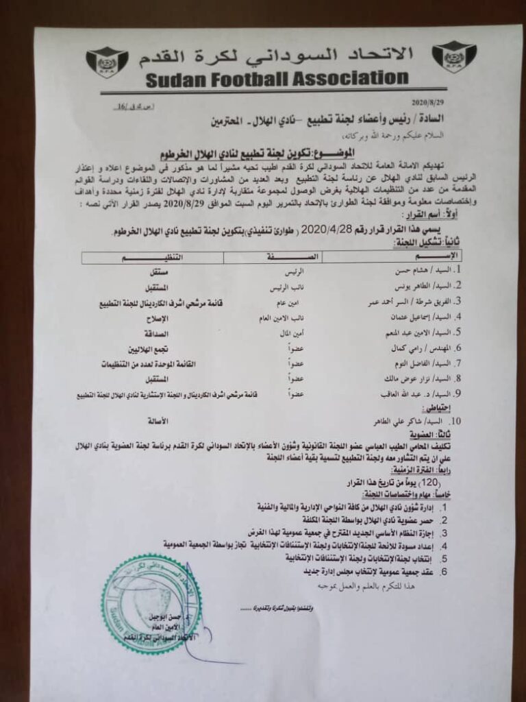 أعلنت الامانة العامة للاتحاد السوداني لكرة القدم عن تكوين لجنة التطبيع لنادي الهلال العاصمي ، حيث شكلت اللجنة من 9 اعضاء واخر احتياطي .