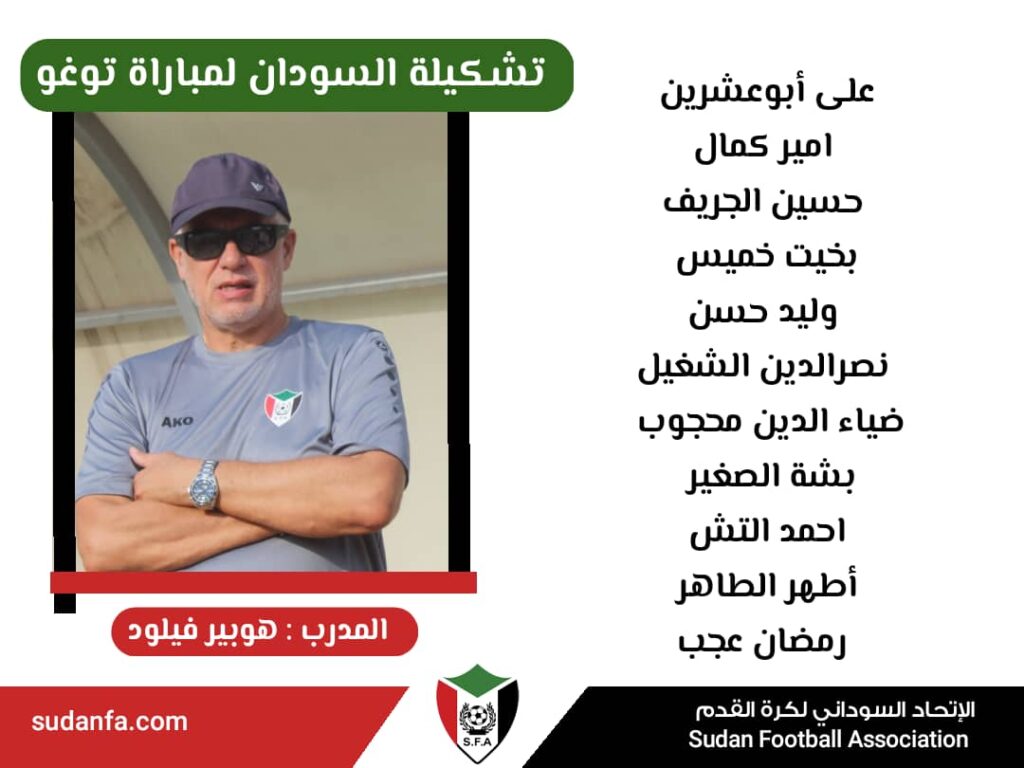 أعلن المدير الفني للمنتخب الوطني السوداني هوبير فيلود تشكيلة المنتخب لمواجهة توغَو عند الرابعة عصراً، وضم التشكيل كل من :