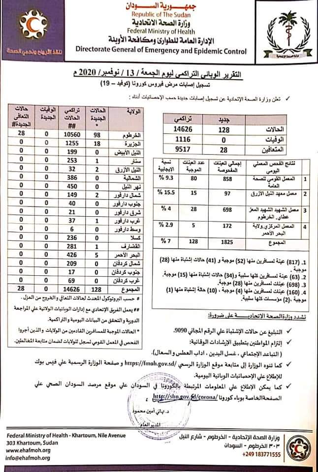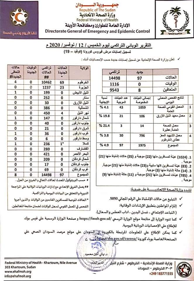 وقالت الإدارة العامة للطوارئ ومكافحة الأوبئة في تقرير صادر ليومي الخميس والجمعة، إن ولاية الخرطوم سجّلت”167″،الجزيرة”41″، كسلا”1″، نهر النيل”4″،سنار”1″، النيل الأزرق”2″، شمال دارفور”2″، غرب دارفور”1″، البحر الأحمر”5″القضارف”1″.