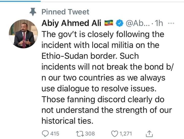 الحكومة الاثيوبية تتابع عن كثب الحادث مع الميليشيات المحلية على الحدود الاثيوبية السودانية، مثل هذه الحوادث لن تكسر الروابط بين بلدينا لأننا نستخدم الحوار دائمًا لحل القضايا. من الواضح أن أولئك الذين يثيرون الفتنة لا يفهمون قوة روابطنا التاريخية.