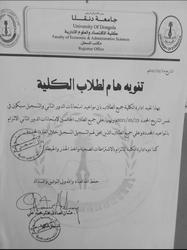 لتأتي في خطوة مفاجئة إدارة جامعة دنقلا تنسف قرارات الوالي ولجنة الطوارئ الصحية بالولاية و توزع منشوراً تؤكد فيه بأن الامتحانات قائم في نفس الموعد يوم الاحد 23 مايو، وتاريخ البيان صادر في ذات الوقت، الذي اجتمعت فيه الولاية، ماذا يسمي هذا ؟ بيانين مختلفان عن بعضهم احداها من الجهة السياسية والصحية بالولاية والاخر من الجهة الاكاديمية من يتابع مايجري في الولاية يشعرك بوجود خلل كبير وعدم تنسيق، وربما نبرة تحدي صريح وعدم اعتراف طرف بالاخر تؤكد ضعف حكومة الولاية في كل الاحوال عموما الطالب وحده هو الخاسر من هذه الاحداث.