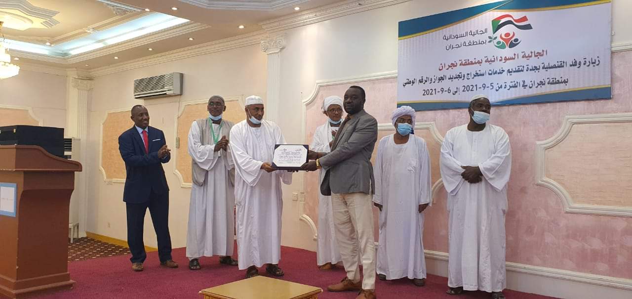 قامت القنصلية السودانية بالمملكة العربية السعودية بزيارة الى منطقة نجران في الفترة من 5-7 سبتمبر الجاري لإجراء تجديد الجوازات واستخراج الرقم الوطني , حيث تم استخراج حوالي 186 رقم للمواليد وتجديد وإصدار جديد حوالي 920 جواز .