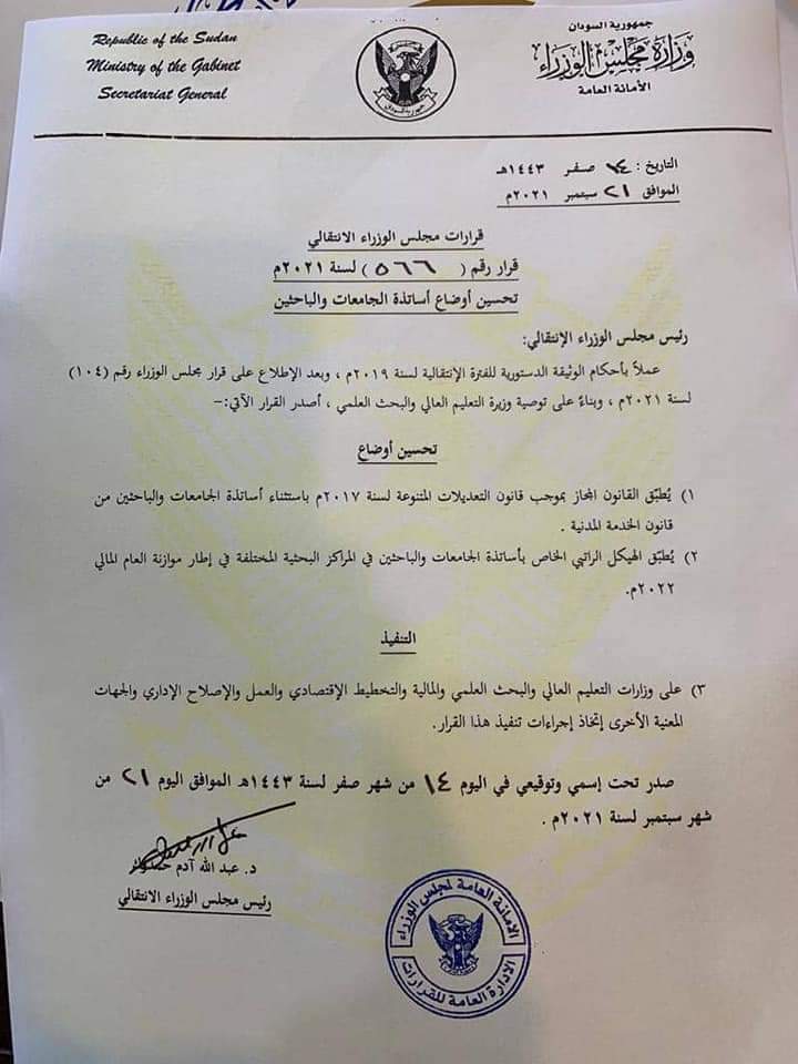 في إطار تحسين أوضاع أساتذة الجامعات والباحثين بمؤسسات التعليم العالي البحث العلمي الحكومية أصدر الدكتور عبدالله حمدوك رئيس مجلس الوزراء مساء اليوم قرار قضى بخروج الأستاذ الجامعي والباحثين من قانون الخدمة المدنية مع تحسين وتعديل الهيكل الراتبي الخاص بهم في موازنة العام 2022م، ووجه القرار وزارات التعليم العالي والبحث العلمي والمالية والعمل والإصلاح الإداري والجهات المعنية الأخرى بإتخاذ إجراءات تنفيذ القرار، ويأتي هذا القرار ضمن الجهود التي بذلتها بروفيسور إنتصار صغيرون الزين وزيرة التعليم العالي والبحث العلمي سعيا لتحسين أوضاع الأستاذ الجامعي والباحثين وذلك لضمان استقرار واستمرار العملية التعليمية وتحفيز أعضاء هيئة التدريس لتحسين الاداء الأكاديمي والذي سينعكس إيجابا في دفع عملية التنمية والاستقرار بالبلاد.