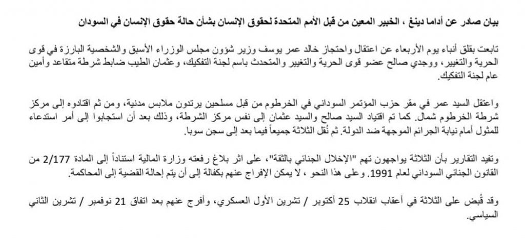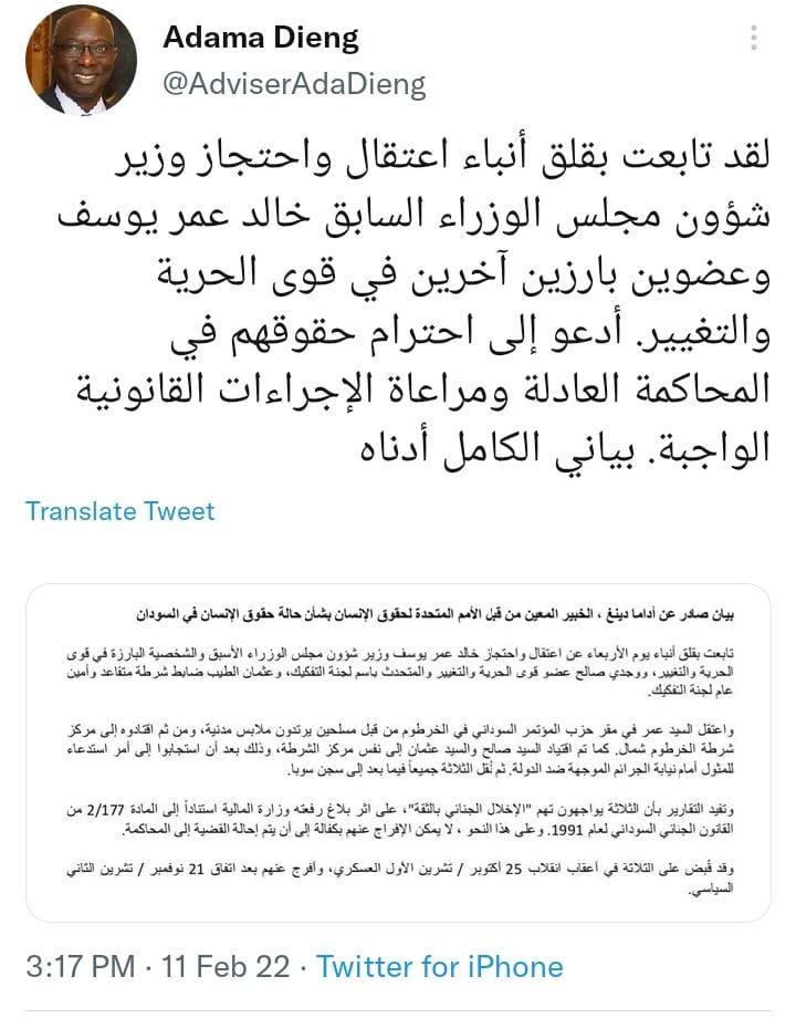 الترندات تغريدة :لمسؤول حقوق الإنسان التابع للأمم المتحدة حول إعتقال خالد عمر الجمعة 10 رجب 1443هـ 11-2-2022مالجمعة 10 رجب 1443هـ 11-2-2022م 905 الترندات تغريدة :لمسؤول حقوق الإنسان التابع للأمم المتحدة حول إعتقال خالد عمر الجمعة 10 رجب 1443هـ 11-2-2022مالجمعة 10 رجب 1443هـ 11-2-2022م 905 التعليقات الأكثر تفاعلاً المحلية - أخبار النجوم قرار بفصل الفنان جمال مصطفى “فرفور” من اتحاد المهن الموسيقية إخترنا لكم الإمارات توقف تأشيرات العمل والسياحة للسودانيين تارا نيوز مدرسة الصداقة السودانية بالقاهرة تصدر قرارات صارمة وتوقف 73 مدرسة ومركزاً عن تدريس المنهج السوداني نهائياً المقالات محمد صلاح يكتب: تزوير العقارات في السودان.. الكارثة الخفية التي تهدد مستقبل البلاد المحلية - سياسية حسم الجدل حول “مستشفى الأبيض”.. استشهاد مهند إبراهيم فضل مؤكدؤ المحلية - سياسية مقترح بإنشاء عاصمة إدارية جديدة لنقل مؤسسات الدولة المحلية - سياسية رسالة مؤثرة من الفريق نصر الدين قائد سلاح المدرعات أحدث الأخبار الترندات الأمير/محمد إبراهيم مادبو موسي : “على أبطال القبائل في دارفور التصدي لمليشيا آل دقلو” الترندات تغريد : كيف تفاعل كامل إدريس رئيس الوزراء مع تأهل المنتخب السوداني ؟! الترندات تغريدة : مناوي : هجوم اليوم من خمسة محاور بذات آلة الإبادة التي أُستخدمت في معسكرة زمزم الترندات تغريدة :خالد عمر يوسف : هذه الجرائم المدانة والمستنكَرة لا ينبغي أن تصبح مشهداً عادياً نتعايش معه في حياتنا اليومية. يجب محاسبة مرتكبيها دون تهاون الترندات تغريدة : مبارك الفاضل: هذه الحرب لم يعد لها هدف غير القتل والسرقة وهدم البنيات الأساسية لذلك يجب التعاون مع المجتمع الدولي لوقفها وملاحقةً قادتها الترندات تغريدة : مبارك الفاضل : خريطة الفريق البرهان التي تتحدث عن حوار سوداني سوداني لا مصداقية لها إذا لم يوقف ملاحقة السياسيين