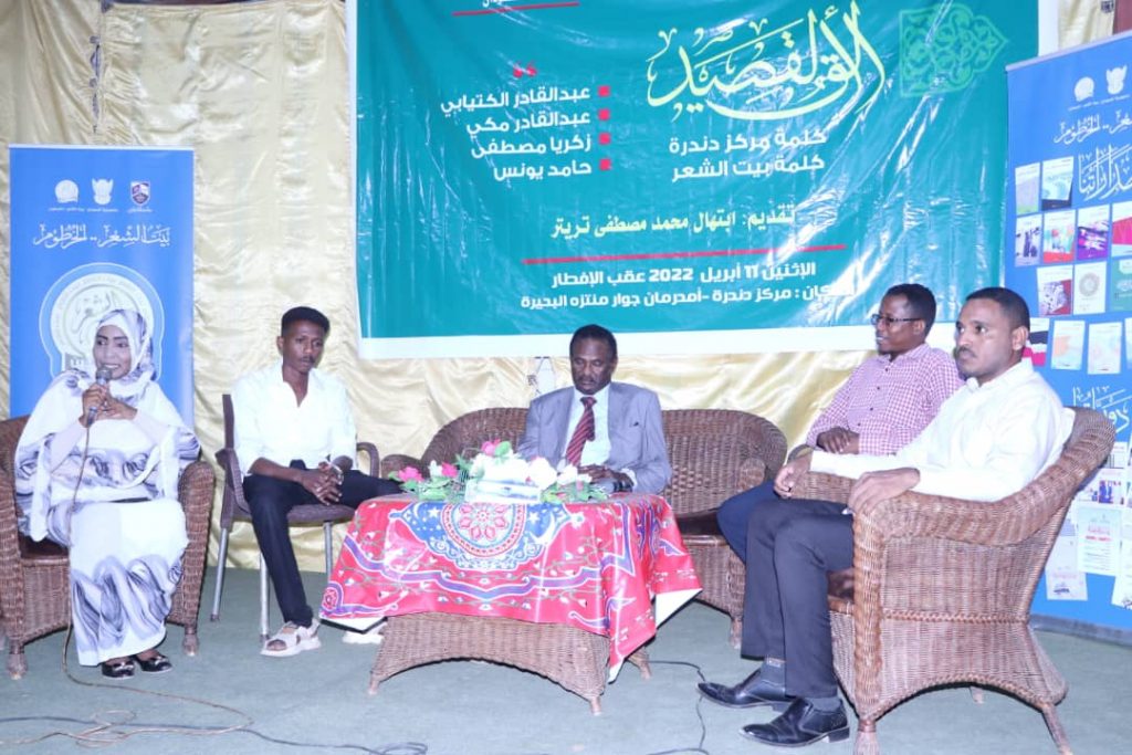 الدكتور الصديق عمر الصديق مدير بيت الشعر الخرطوم خلال مخاطبته أمسية (ألق القصيد) وعد بتكرار مثل هذه الفعاليات التي تجمع بيت الشعر ومركز دندرة الثقافي في تعاون ثقافي مثمر، وأشار بأن هذه الفعالية لن تكون (بيضعة الديك) بل ستكون هناك فعاليات أخرى قادمة، شاكرا حسن استقبال الأسرة الدندراوية لبيت الشعر.