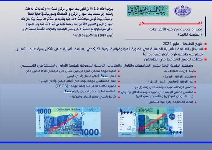 أعلن بنك السودان المركزي اليوم إصدار طبعة ثانية من فئة الالف جنيه وذلك بموجب أحكام المادة 6/أ من قانون بنك السودان المركزي لسنة 2002 وتعديلاته اللاحقة، واستناداً إلى سلطات بنك السودان المركزي واختصاصاته ومسؤولياته في حماية العملة الوطنية، وبهدف توطين طباعة فئة الألف جنيه وتجويد مواصفاتها التأمينية،