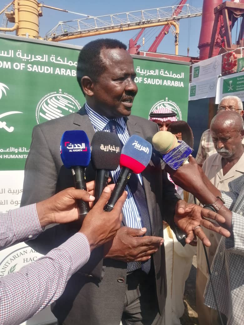 ومن. جانبه أكد نائب السفير ان هذا اليوم هو يوم مبارك بتشريف مساعدة إنسانية تنفيذا للتوجيهات السامية من لدن خادم الحرمين الشريفين الملك سلمان بن عبدالعزيز ومن لدن ولي عهده صاحب السمو الملكي الأمير محمد بن سلمان وهي عبارة عن شحنة من القمح ٥٢الف و٥٢١طن مقدمه للشعب السوداني مبينا انها تأتي في إطار المساعدات الإنسانية المستمرة التي تقدمها المملكة للشقيقة السودان انطلاقا من العلاقات الأخوية الوطيدة بين الشعبين السعودي والسوداني وسيتم تسليمه لمفو ضية العون الانساني وتوزيعها بالتنسيق بين مركز الملك سلمان للاغاثة والاعمال الإنسانية ومفوصبة العون الانساني. وشكر نائب السفير القيادة السودانية على تسهيل إجراءات دخول المساعدات الإنسانية وتعاونها التوثيق مع مركز الملك. سلمان مشيدا بجهود كل. من ساعد بصول هذة الشحنة للسودان.