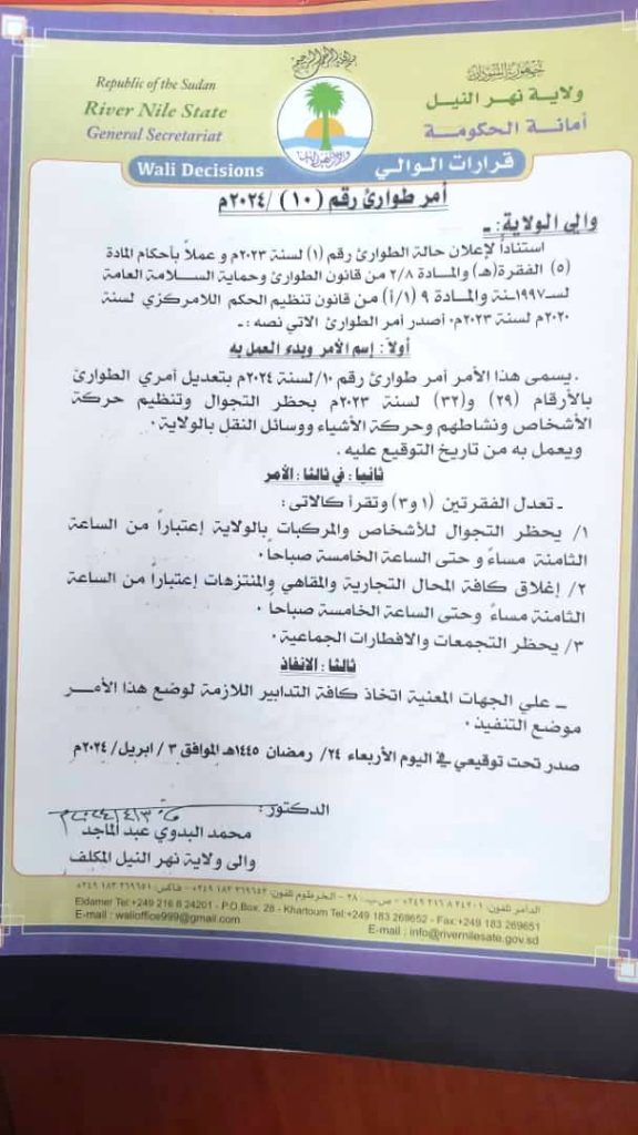 اصدرت لجنة أمن ولاية نهرالنيل قراراً بحظر تجوال الأشخاص والمركبات بكافة محليات الولاية من الساعة الثامنة مساءً وحتى السادسة صباحاً يومياً اعتباراً من تاريخ اليوم الأربعاء الموافق الثالث من أبريل العام 2024.