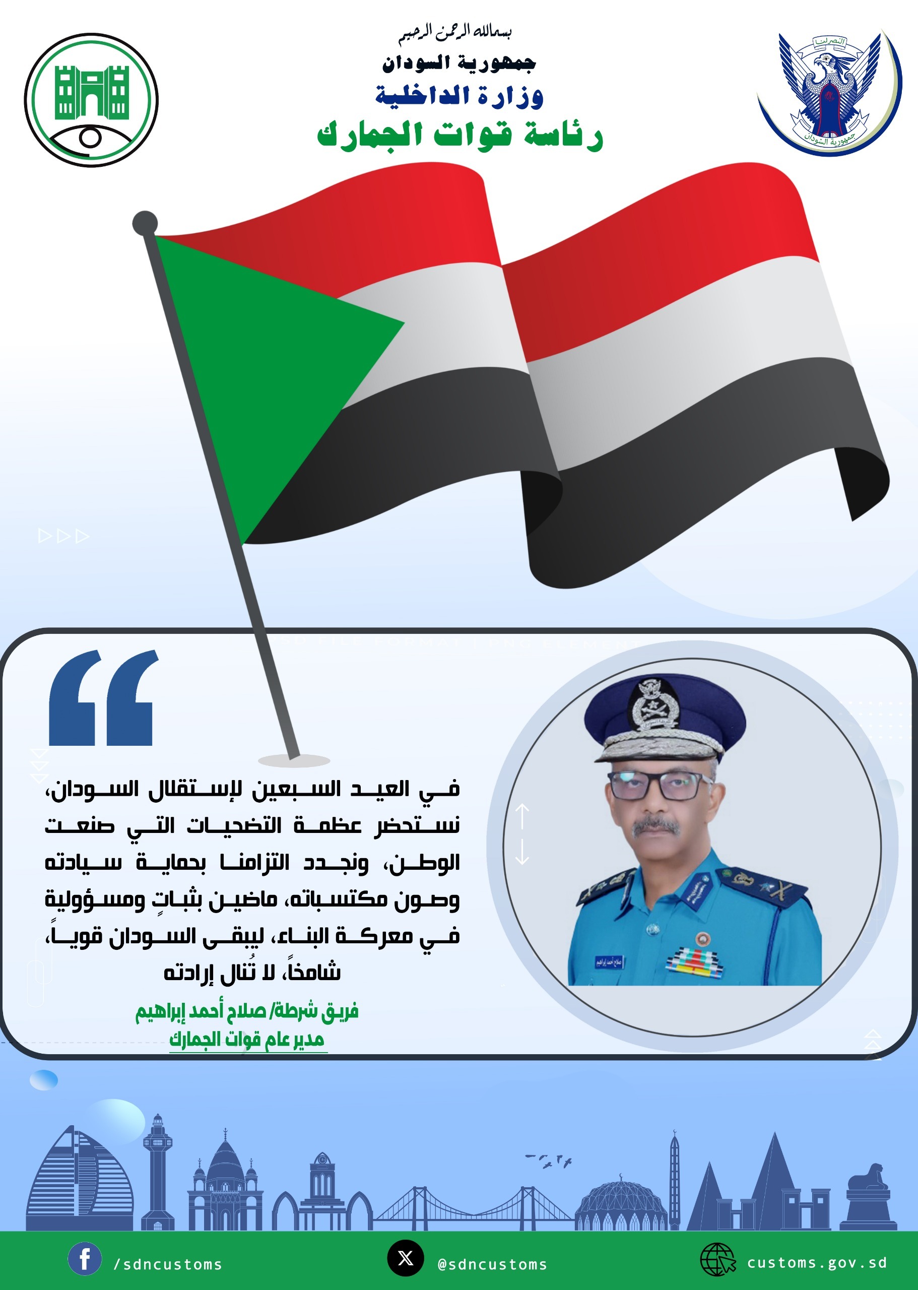 حيا مدير عام قوات الجمارك الفريق شرطة صلاح أحمد إبراهيم ، الشعب السوداني وقيادات الدولة ، والقوات المسلحة ، والقوات الشرطية بمختلف القطاعات ، والأجهزة الأمنية ، بمناسبة الذكرى الـ 70 لاستقلال السودان