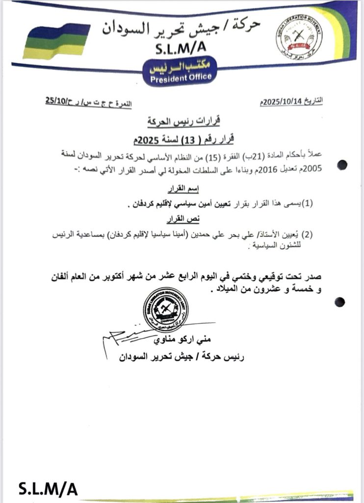 أصدر القائد مني أركو مناوي ، رئيس حركة جيش تحرير السودان ، قرارا بتعيين الاستاذ علي بحر علي حمدين امينا سياسيا لمكتب الحركة باقليم كردفان